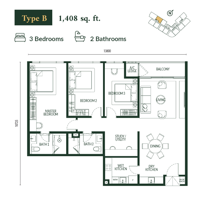 | Type B | 1408 sqft | Bedroom: 3 Bathroom: 2 Partially furnished: eco-responsible design (GreenRE) |